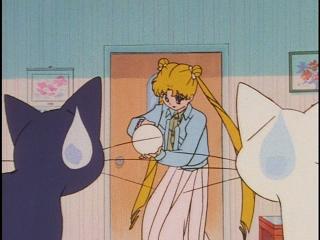 Luna and Artemis have doubts that Usagi can protect everyone alone and talk about restoring the Sailors’ memories. Usagi thinks otherwise and throws a ball against the wall but it bounces back and hits her.